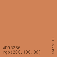 Цвет #D08256 в цветовой модели RGB обозначается тремя октетами (208, 130, 86) в десятичном формате и #D08256 в шестнадцатиричном (hex) формате, которые являются интенсивностью красного 208 (hex D0), интенсивность зелёного 130 (hex 82) и интенсивность синего 86 (hex 56).