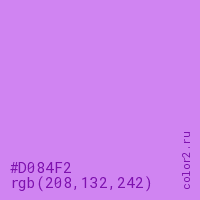 Цвет #D084F2 в цветовой модели RGB обозначается тремя октетами (208, 132, 242) в десятичном формате и #D084F2 в шестнадцатиричном (hex) формате, которые являются интенсивностью красного 208 (hex D0), интенсивность зелёного 132 (hex 84) и интенсивность синего 242 (hex F2).