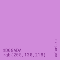 Цвет #D08ADA в цветовой модели RGB обозначается тремя октетами (208, 138, 218) в десятичном формате и #D08ADA в шестнадцатиричном (hex) формате, которые являются интенсивностью красного 208 (hex D0), интенсивность зелёного 138 (hex 8A) и интенсивность синего 218 (hex DA).