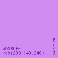 Цвет #D08CF0 в цветовой модели RGB обозначается тремя октетами (208, 140, 240) в десятичном формате и #D08CF0 в шестнадцатиричном (hex) формате, которые являются интенсивностью красного 208 (hex D0), интенсивность зелёного 140 (hex 8C) и интенсивность синего 240 (hex F0).