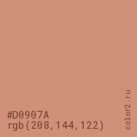 Цвет #D0907A в цветовой модели RGB обозначается тремя октетами (208, 144, 122) в десятичном формате и #D0907A в шестнадцатиричном (hex) формате, которые являются интенсивностью красного 208 (hex D0), интенсивность зелёного 144 (hex 90) и интенсивность синего 122 (hex 7A).