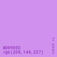 Цвет #D090ED в цветовой модели RGB обозначается тремя октетами (208, 144, 237) в десятичном формате и #D090ED в шестнадцатиричном (hex) формате, которые являются интенсивностью красного 208 (hex D0), интенсивность зелёного 144 (hex 90) и интенсивность синего 237 (hex ED).