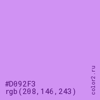 Цвет #D092F3 в цветовой модели RGB обозначается тремя октетами (208, 146, 243) в десятичном формате и #D092F3 в шестнадцатиричном (hex) формате, которые являются интенсивностью красного 208 (hex D0), интенсивность зелёного 146 (hex 92) и интенсивность синего 243 (hex F3).