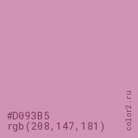 Цвет #D093B5 в цветовой модели RGB обозначается тремя октетами (208, 147, 181) в десятичном формате и #D093B5 в шестнадцатиричном (hex) формате, которые являются интенсивностью красного 208 (hex D0), интенсивность зелёного 147 (hex 93) и интенсивность синего 181 (hex B5).