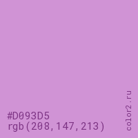 Цвет #D093D5 в цветовой модели RGB обозначается тремя октетами (208, 147, 213) в десятичном формате и #D093D5 в шестнадцатиричном (hex) формате, которые являются интенсивностью красного 208 (hex D0), интенсивность зелёного 147 (hex 93) и интенсивность синего 213 (hex D5).