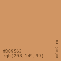 Цвет #D09563 в цветовой модели RGB обозначается тремя октетами (208, 149, 99) в десятичном формате и #D09563 в шестнадцатиричном (hex) формате, которые являются интенсивностью красного 208 (hex D0), интенсивность зелёного 149 (hex 95) и интенсивность синего 99 (hex 63).