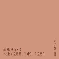 Цвет #D0957D в цветовой модели RGB обозначается тремя октетами (208, 149, 125) в десятичном формате и #D0957D в шестнадцатиричном (hex) формате, которые являются интенсивностью красного 208 (hex D0), интенсивность зелёного 149 (hex 95) и интенсивность синего 125 (hex 7D).