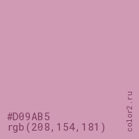 Цвет #D09AB5 в цветовой модели RGB обозначается тремя октетами (208, 154, 181) в десятичном формате и #D09AB5 в шестнадцатиричном (hex) формате, которые являются интенсивностью красного 208 (hex D0), интенсивность зелёного 154 (hex 9A) и интенсивность синего 181 (hex B5).