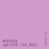 Цвет #D09ACB в цветовой модели RGB обозначается тремя октетами (208, 154, 203) в десятичном формате и #D09ACB в шестнадцатиричном (hex) формате, которые являются интенсивностью красного 208 (hex D0), интенсивность зелёного 154 (hex 9A) и интенсивность синего 203 (hex CB).