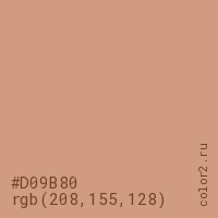 Цвет #D09B80 в цветовой модели RGB обозначается тремя октетами (208, 155, 128) в десятичном формате и #D09B80 в шестнадцатиричном (hex) формате, которые являются интенсивностью красного 208 (hex D0), интенсивность зелёного 155 (hex 9B) и интенсивность синего 128 (hex 80).