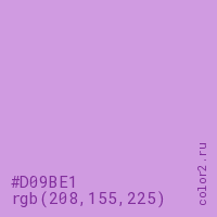 Цвет #D09BE1 в цветовой модели RGB обозначается тремя октетами (208, 155, 225) в десятичном формате и #D09BE1 в шестнадцатиричном (hex) формате, которые являются интенсивностью красного 208 (hex D0), интенсивность зелёного 155 (hex 9B) и интенсивность синего 225 (hex E1).