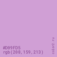 Цвет #D09FD5 в цветовой модели RGB обозначается тремя октетами (208, 159, 213) в десятичном формате и #D09FD5 в шестнадцатиричном (hex) формате, которые являются интенсивностью красного 208 (hex D0), интенсивность зелёного 159 (hex 9F) и интенсивность синего 213 (hex D5).