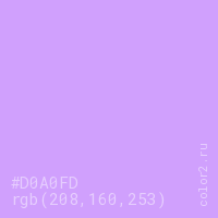 Цвет #D0A0FD в цветовой модели RGB обозначается тремя октетами (208, 160, 253) в десятичном формате и #D0A0FD в шестнадцатиричном (hex) формате, которые являются интенсивностью красного 208 (hex D0), интенсивность зелёного 160 (hex A0) и интенсивность синего 253 (hex FD).