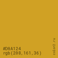 Цвет #D0A124 в цветовой модели RGB обозначается тремя октетами (208, 161, 36) в десятичном формате и #D0A124 в шестнадцатиричном (hex) формате, которые являются интенсивностью красного 208 (hex D0), интенсивность зелёного 161 (hex A1) и интенсивность синего 36 (hex 24).