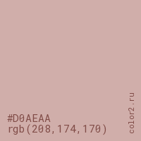 Цвет #D0AEAA в цветовой модели RGB обозначается тремя октетами (208, 174, 170) в десятичном формате и #D0AEAA в шестнадцатиричном (hex) формате, которые являются интенсивностью красного 208 (hex D0), интенсивность зелёного 174 (hex AE) и интенсивность синего 170 (hex AA).