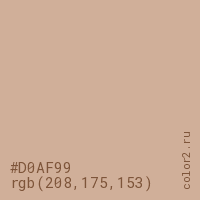 Цвет #D0AF99 в цветовой модели RGB обозначается тремя октетами (208, 175, 153) в десятичном формате и #D0AF99 в шестнадцатиричном (hex) формате, которые являются интенсивностью красного 208 (hex D0), интенсивность зелёного 175 (hex AF) и интенсивность синего 153 (hex 99).