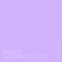 Цвет #D0B2FC в цветовой модели RGB обозначается тремя октетами (208, 178, 252) в десятичном формате и #D0B2FC в шестнадцатиричном (hex) формате, которые являются интенсивностью красного 208 (hex D0), интенсивность зелёного 178 (hex B2) и интенсивность синего 252 (hex FC).