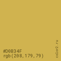 Цвет #D0B34F в цветовой модели RGB обозначается тремя октетами (208, 179, 79) в десятичном формате и #D0B34F в шестнадцатиричном (hex) формате, которые являются интенсивностью красного 208 (hex D0), интенсивность зелёного 179 (hex B3) и интенсивность синего 79 (hex 4F).