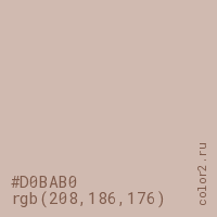 Цвет #D0BAB0 в цветовой модели RGB обозначается тремя октетами (208, 186, 176) в десятичном формате и #D0BAB0 в шестнадцатиричном (hex) формате, которые являются интенсивностью красного 208 (hex D0), интенсивность зелёного 186 (hex BA) и интенсивность синего 176 (hex B0).