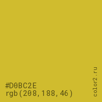 Цвет #D0BC2E в цветовой модели RGB обозначается тремя октетами (208, 188, 46) в десятичном формате и #D0BC2E в шестнадцатиричном (hex) формате, которые являются интенсивностью красного 208 (hex D0), интенсивность зелёного 188 (hex BC) и интенсивность синего 46 (hex 2E).