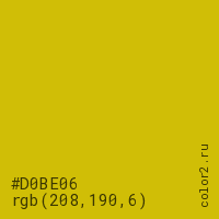 Цвет #D0BE06 в цветовой модели RGB обозначается тремя октетами (208, 190, 6) в десятичном формате и #D0BE06 в шестнадцатиричном (hex) формате, которые являются интенсивностью красного 208 (hex D0), интенсивность зелёного 190 (hex BE) и интенсивность синего 6 (hex 06).