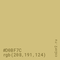 Цвет #D0BF7C в цветовой модели RGB обозначается тремя октетами (208, 191, 124) в десятичном формате и #D0BF7C в шестнадцатиричном (hex) формате, которые являются интенсивностью красного 208 (hex D0), интенсивность зелёного 191 (hex BF) и интенсивность синего 124 (hex 7C).