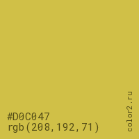 Цвет #D0C047 в цветовой модели RGB обозначается тремя октетами (208, 192, 71) в десятичном формате и #D0C047 в шестнадцатиричном (hex) формате, которые являются интенсивностью красного 208 (hex D0), интенсивность зелёного 192 (hex C0) и интенсивность синего 71 (hex 47).