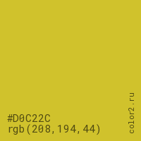 Цвет #D0C22C в цветовой модели RGB обозначается тремя октетами (208, 194, 44) в десятичном формате и #D0C22C в шестнадцатиричном (hex) формате, которые являются интенсивностью красного 208 (hex D0), интенсивность зелёного 194 (hex C2) и интенсивность синего 44 (hex 2C).