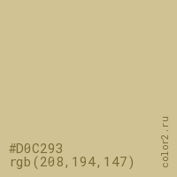 Цвет #D0C293 в цветовой модели RGB обозначается тремя октетами (208, 194, 147) в десятичном формате и #D0C293 в шестнадцатиричном (hex) формате, которые являются интенсивностью красного 208 (hex D0), интенсивность зелёного 194 (hex C2) и интенсивность синего 147 (hex 93).