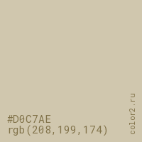 Цвет #D0C7AE в цветовой модели RGB обозначается тремя октетами (208, 199, 174) в десятичном формате и #D0C7AE в шестнадцатиричном (hex) формате, которые являются интенсивностью красного 208 (hex D0), интенсивность зелёного 199 (hex C7) и интенсивность синего 174 (hex AE).