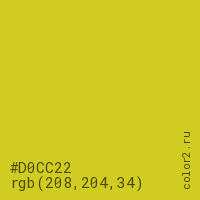 Цвет #D0CC22 в цветовой модели RGB обозначается тремя октетами (208, 204, 34) в десятичном формате и #D0CC22 в шестнадцатиричном (hex) формате, которые являются интенсивностью красного 208 (hex D0), интенсивность зелёного 204 (hex CC) и интенсивность синего 34 (hex 22).