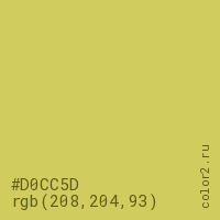 Цвет #D0CC5D в цветовой модели RGB обозначается тремя октетами (208, 204, 93) в десятичном формате и #D0CC5D в шестнадцатиричном (hex) формате, которые являются интенсивностью красного 208 (hex D0), интенсивность зелёного 204 (hex CC) и интенсивность синего 93 (hex 5D).
