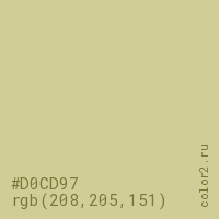 Цвет #D0CD97 в цветовой модели RGB обозначается тремя октетами (208, 205, 151) в десятичном формате и #D0CD97 в шестнадцатиричном (hex) формате, которые являются интенсивностью красного 208 (hex D0), интенсивность зелёного 205 (hex CD) и интенсивность синего 151 (hex 97).