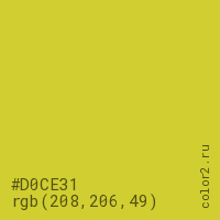 Цвет #D0CE31 в цветовой модели RGB обозначается тремя октетами (208, 206, 49) в десятичном формате и #D0CE31 в шестнадцатиричном (hex) формате, которые являются интенсивностью красного 208 (hex D0), интенсивность зелёного 206 (hex CE) и интенсивность синего 49 (hex 31).
