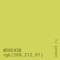 Цвет #D0D45B в цветовой модели RGB обозначается тремя октетами (208, 212, 91) в десятичном формате и #D0D45B в шестнадцатиричном (hex) формате, которые являются интенсивностью красного 208 (hex D0), интенсивность зелёного 212 (hex D4) и интенсивность синего 91 (hex 5B).