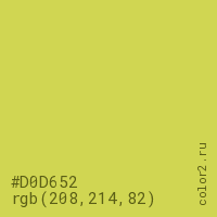 Цвет #D0D652 в цветовой модели RGB обозначается тремя октетами (208, 214, 82) в десятичном формате и #D0D652 в шестнадцатиричном (hex) формате, которые являются интенсивностью красного 208 (hex D0), интенсивность зелёного 214 (hex D6) и интенсивность синего 82 (hex 52).