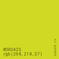 Цвет #D0DA25 в цветовой модели RGB обозначается тремя октетами (208, 218, 37) в десятичном формате и #D0DA25 в шестнадцатиричном (hex) формате, которые являются интенсивностью красного 208 (hex D0), интенсивность зелёного 218 (hex DA) и интенсивность синего 37 (hex 25).