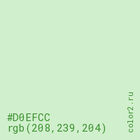 Цвет #D0EFCC в цветовой модели RGB обозначается тремя октетами (208, 239, 204) в десятичном формате и #D0EFCC в шестнадцатиричном (hex) формате, которые являются интенсивностью красного 208 (hex D0), интенсивность зелёного 239 (hex EF) и интенсивность синего 204 (hex CC).