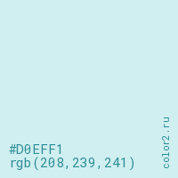 Цвет #D0EFF1 в цветовой модели RGB обозначается тремя октетами (208, 239, 241) в десятичном формате и #D0EFF1 в шестнадцатиричном (hex) формате, которые являются интенсивностью красного 208 (hex D0), интенсивность зелёного 239 (hex EF) и интенсивность синего 241 (hex F1).