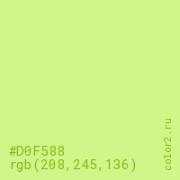 Цвет #D0F588 в цветовой модели RGB обозначается тремя октетами (208, 245, 136) в десятичном формате и #D0F588 в шестнадцатиричном (hex) формате, которые являются интенсивностью красного 208 (hex D0), интенсивность зелёного 245 (hex F5) и интенсивность синего 136 (hex 88).