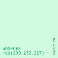 Цвет #D0FCE3 в цветовой модели RGB обозначается тремя октетами (208, 252, 227) в десятичном формате и #D0FCE3 в шестнадцатиричном (hex) формате, которые являются интенсивностью красного 208 (hex D0), интенсивность зелёного 252 (hex FC) и интенсивность синего 227 (hex E3).