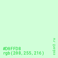 Цвет #D0FFD8 в цветовой модели RGB обозначается тремя октетами (208, 255, 216) в десятичном формате и #D0FFD8 в шестнадцатиричном (hex) формате, которые являются интенсивностью красного 208 (hex D0), интенсивность зелёного 255 (hex FF) и интенсивность синего 216 (hex D8).