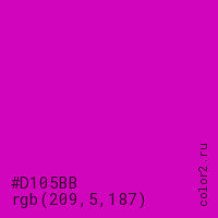 Цвет #D105BB в цветовой модели RGB обозначается тремя октетами (209, 5, 187) в десятичном формате и #D105BB в шестнадцатиричном (hex) формате, которые являются интенсивностью красного 209 (hex D1), интенсивность зелёного 5 (hex 05) и интенсивность синего 187 (hex BB).