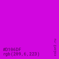 Цвет #D106DF в цветовой модели RGB обозначается тремя октетами (209, 6, 223) в десятичном формате и #D106DF в шестнадцатиричном (hex) формате, которые являются интенсивностью красного 209 (hex D1), интенсивность зелёного 6 (hex 06) и интенсивность синего 223 (hex DF).