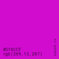 Цвет #D10CCF в цветовой модели RGB обозначается тремя октетами (209, 12, 207) в десятичном формате и #D10CCF в шестнадцатиричном (hex) формате, которые являются интенсивностью красного 209 (hex D1), интенсивность зелёного 12 (hex 0C) и интенсивность синего 207 (hex CF).