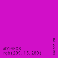 Цвет #D10FC8 в цветовой модели RGB обозначается тремя октетами (209, 15, 200) в десятичном формате и #D10FC8 в шестнадцатиричном (hex) формате, которые являются интенсивностью красного 209 (hex D1), интенсивность зелёного 15 (hex 0F) и интенсивность синего 200 (hex C8).