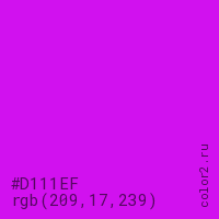 Цвет #D111EF в цветовой модели RGB обозначается тремя октетами (209, 17, 239) в десятичном формате и #D111EF в шестнадцатиричном (hex) формате, которые являются интенсивностью красного 209 (hex D1), интенсивность зелёного 17 (hex 11) и интенсивность синего 239 (hex EF).