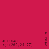 Цвет #D1184D в цветовой модели RGB обозначается тремя октетами (209, 24, 77) в десятичном формате и #D1184D в шестнадцатиричном (hex) формате, которые являются интенсивностью красного 209 (hex D1), интенсивность зелёного 24 (hex 18) и интенсивность синего 77 (hex 4D).