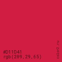 Цвет #D11D41 в цветовой модели RGB обозначается тремя октетами (209, 29, 65) в десятичном формате и #D11D41 в шестнадцатиричном (hex) формате, которые являются интенсивностью красного 209 (hex D1), интенсивность зелёного 29 (hex 1D) и интенсивность синего 65 (hex 41).