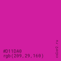 Цвет #D11DA0 в цветовой модели RGB обозначается тремя октетами (209, 29, 160) в десятичном формате и #D11DA0 в шестнадцатиричном (hex) формате, которые являются интенсивностью красного 209 (hex D1), интенсивность зелёного 29 (hex 1D) и интенсивность синего 160 (hex A0).